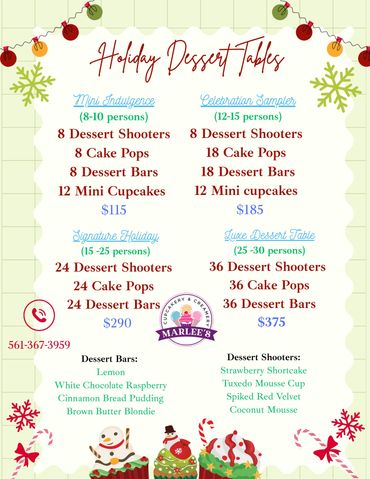 View our dessert tables for the holiday season on the Shop page! Call us to place holiday orders or customize to theme or add company logos!